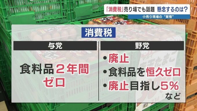今回の選挙では、与党は「2年間に限りゼロにする検討を加速」。野党は「廃止」や「恒久ゼロ」、「段階的廃止を目指し緊急的に5%」などと公約に盛り込む方針です。