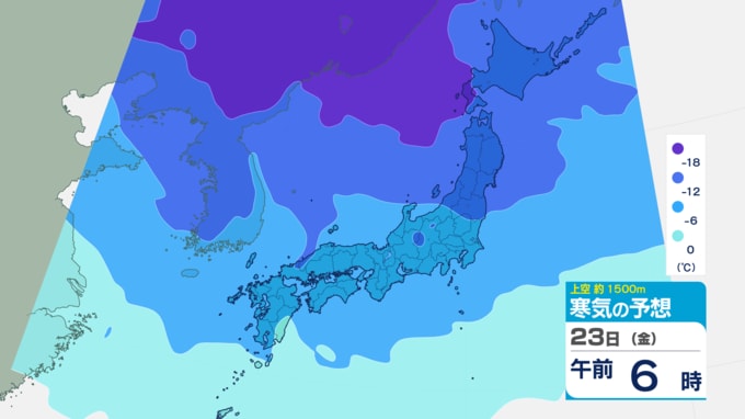 23日(金)の最低気温はマイナス3℃から2℃、最高気温は5℃から9℃の見込みです。