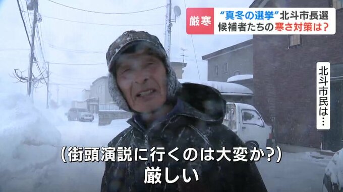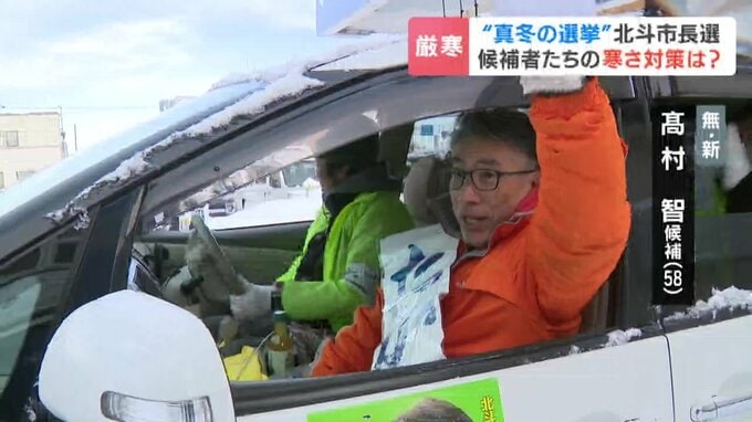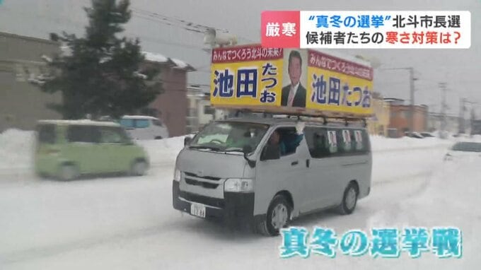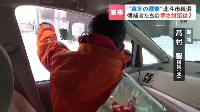 2006年から真冬に行われる北斗市長選。候補者たちは、寒さ対策も抜かりはありません。