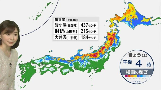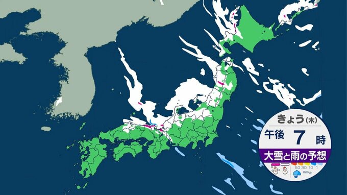 木曜日夜は北陸や近畿の北部を中心に大雪が続きます。金曜日の朝には近畿北部ではおさまってきますが、北陸から北では金曜日も雪が続き、北陸を中心に大雪の所が出てきそうです。