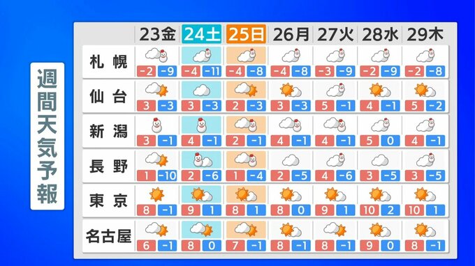 日本海側では日曜日にかけて大雪が続き、月曜日は一旦弱まりますが、再び火曜日以降は広く雪となる可能性があります。東京は晴れの天気が続きますが、最低気温は0℃前後、最高気温は10℃以下という、大寒らしい寒さが続く予想です。