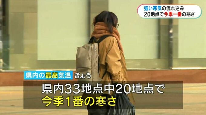 そして日中も気温は上がらず、鹿屋市輝北で3.6度、阿久根市と霧島市牧之原で4.7度と、県内33の観測地点のうち、20地点で今季1番の寒さを記録しました。