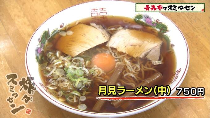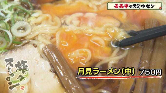 川口さんは【月見ラーメン・中】(750円)をいただきます。麺の上には生卵がトッピングされています。
