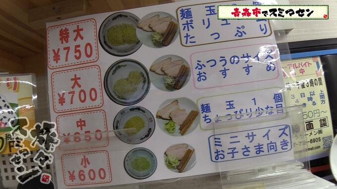 麺の量は、特大、大、中、小と4サイズから選べます。八郎さんは【チャーシューメン・大】(900円)を注文しました。