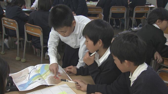 子どもたちは、グループに分かれて、避難前に確認が必要なことや、避難するルートについて意見を出し合います。