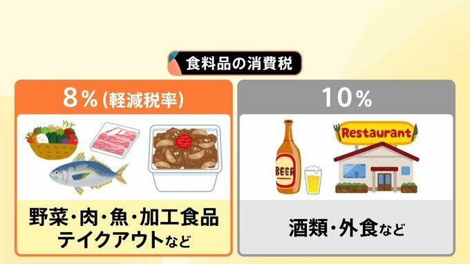 現在、食料品の消費税は▲酒類・外食などには「10%」、▲野菜・肉・加工食品・テイクアウトなどには「8%(軽減税率)」 が課せられています。