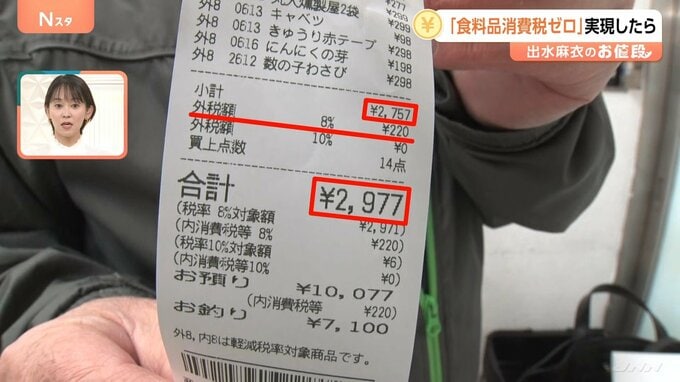 「合計1699円、消費税125円。食費だけでも10万円使ってるから、1か月ね。(消費税が)ゼロになったら言うことない」
