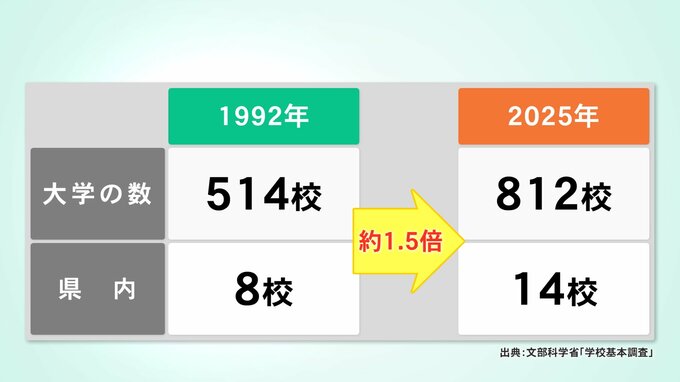 4年制大学の数は、1992年当時は全国で514校ありましたが、現在は812校と1.5倍以上に増えていて、石川県内でも8校から14校に増えています。