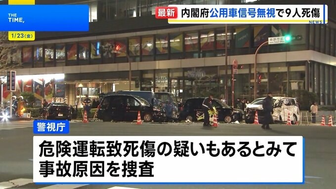 警視庁によりますと、内閣府の公用車が赤信号を無視して交差点に進入していたことがドライブレコーダーの捜査などからわかったということです。公用車を運転していたのは、内閣府から運転業務を委託されている会社の69歳の男性で、重傷です。