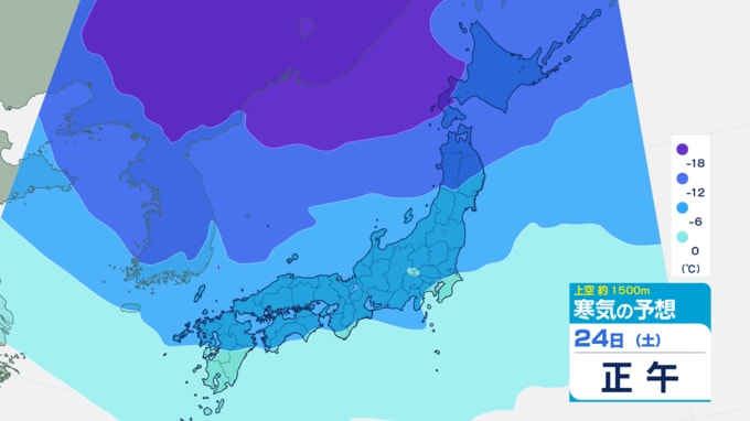 今回の寒波が「最強」と言われる理由は、その寒気の強さです。 東日本の上空約5000メートルには氷点下40度以下、西日本の上空約1500メートルにも氷点下12度以下という、平年を大きく下回る寒気が25日(日)頃にかけて断続的に流れ込みます。