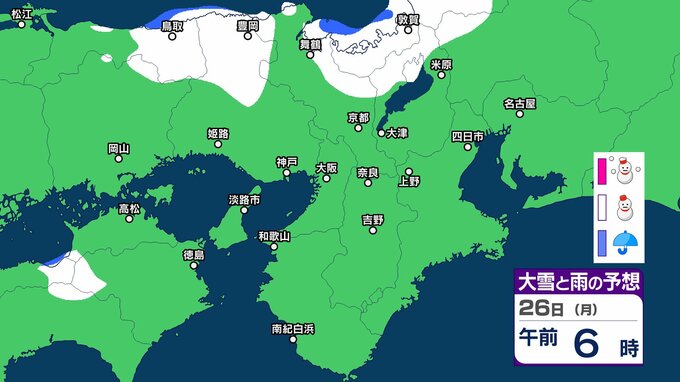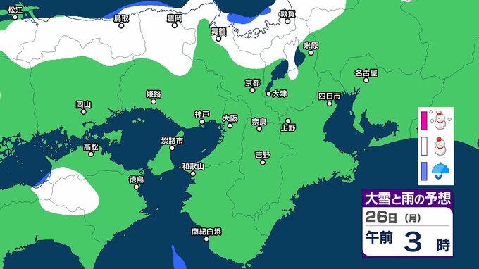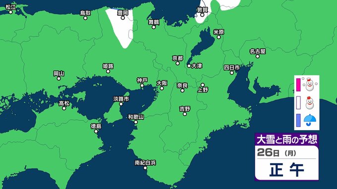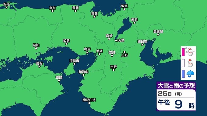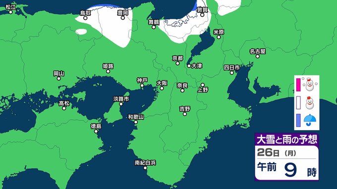 【関西の雪どうなる?】降雪のピークは過ぎるも、近畿北部では今夜遅くにかけて寒気の影響が残る見込み 近畿北部山地は40センチの降雪予想 雪はいつ、どこで降る?大阪・京都・神戸・滋賀・奈良・和歌山 23日(金)~28日(水)雪雨シミュレーション【気象庁 23日現在】 RSK山陽放送 2026年1月23日(金) 09:45 国内 天気 26日(月) ▶23日(金)~28日(水)近畿地方の雪雨シミュレーション画像