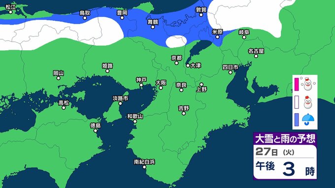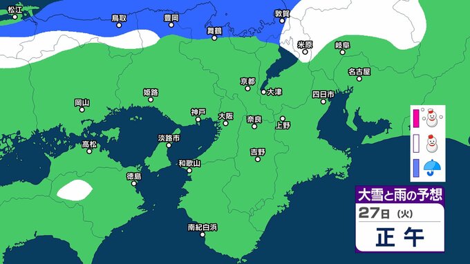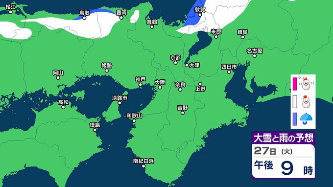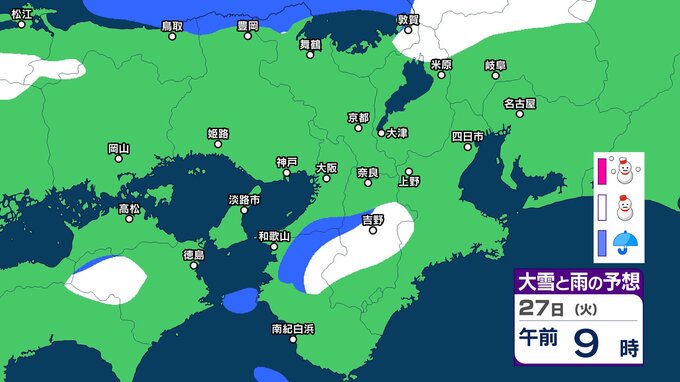 【関西の雪どうなる?】降雪のピークは過ぎるも、近畿北部では今夜遅くにかけて寒気の影響が残る見込み 近畿北部山地は40センチの降雪予想 雪はいつ、どこで降る?大阪・京都・神戸・滋賀・奈良・和歌山 23日(金)~28日(水)雪雨シミュレーション【気象庁 23日現在】 RSK山陽放送 2026年1月23日(金) 09:45 国内 天気 27日(火) ▶23日(金)~28日(水)近畿地方の雪雨シミュレーション画像
