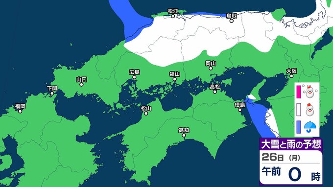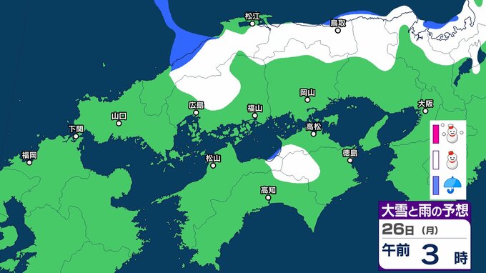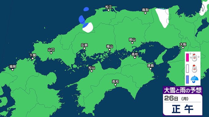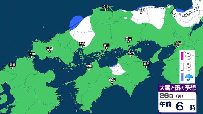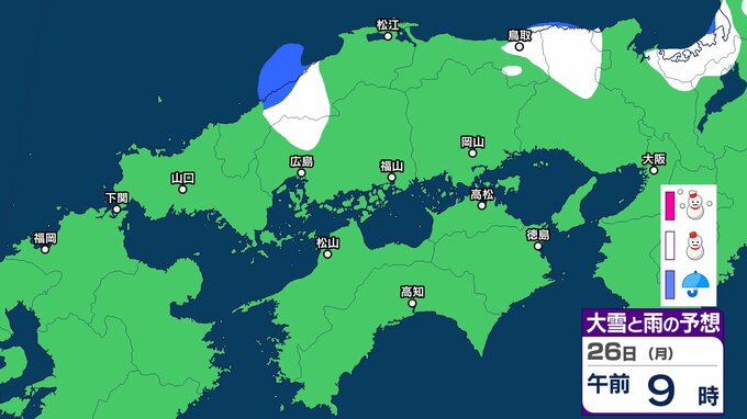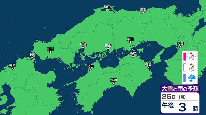 【中国・四国地方の雪 どうなる?】四国地方は23日夜遅くから24日夜のはじめにかけて山地を中心に大雪、平地でも積雪のおそれ 岡山・広島・山口・鳥取・島根・香川・愛媛・高知・徳島 23日(金)~28日(水)雪雨シミュレーション【気象庁 23日現在】 RSK山陽放送 2026年1月23日(金) 10:31 国内 天気 26日(月) シミュレーションでは、中国山地、四国山地に雪雲がかかっています。 28日までの雪シミュレーション 22 23 24 25 28 29 ▶中国・四国地方の雪雨シミュレーション