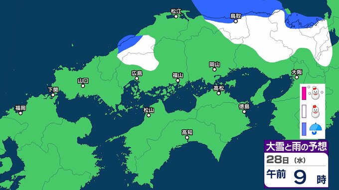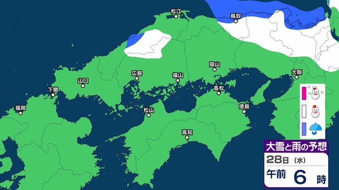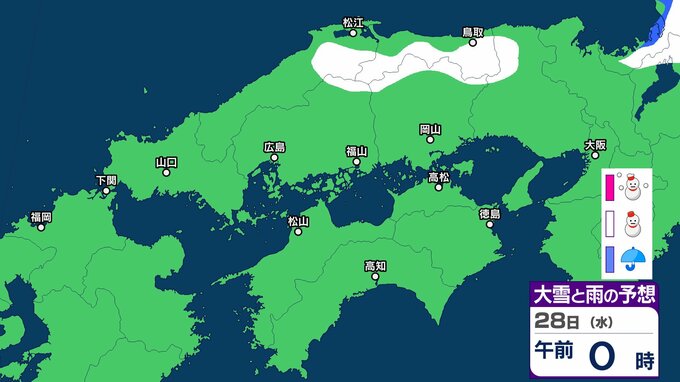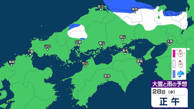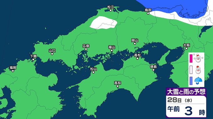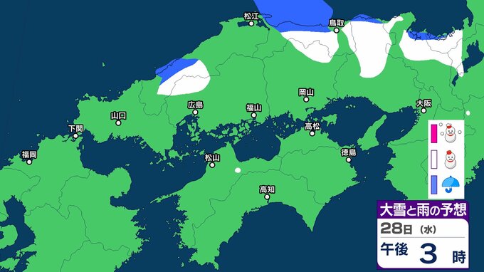 【中国・四国地方の雪 どうなる?】四国地方は23日夜遅くから24日夜のはじめにかけて山地を中心に大雪、平地でも積雪のおそれ 岡山・広島・山口・鳥取・島根・香川・愛媛・高知・徳島 23日(金)~28日(水)雪雨シミュレーション【気象庁 23日現在】 RSK山陽放送 2026年1月23日(金) 10:31 国内 天気 28日(水) シミュレーションでは、鳥取、島根、広島、岡山の一部に雪雲がかかっています。 38 39 40 41 42 43 予想にはブレ幅があるため、今後の気象情報をこまめに確認してください。 ▶中国・四国地方の雪雨シミュレーション