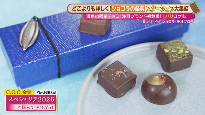 味覚の魔術師・土屋シェフの魅力を存分に感じられる新作は、日本の素材とチョコレートの融合がテーマのボンボンショコラ。中でも、「C.C.C.」で金賞を受賞した「スペシャリテ2026」(4個入り 2,751円)はイチオシ!