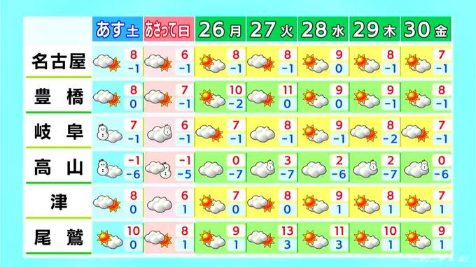 週末は岐阜で“警報級大雪”おそれ 東海地方はきょう午後も雪 愛知・名古屋・岐阜・三重の天気予報(1/23 昼)【大雪情報】 CBCテレビ 2026年1月23日(金) 12:25 国内 天気 岐阜で“警報級大雪”に注意 【週間予報】 週末は岐阜県で警報級の大雪になるおそれがあるでしょう。愛知県や三重県の平地でも再び雪が降る予想です。引き続き最新の気象情報や交通情報をご確認ください。