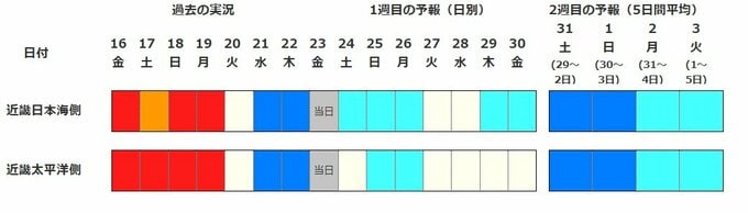 近畿地方の向こう2週間の気温は、冬型の気圧配置が強まる時期があり、寒気の影響を受けやすいため低い日が多く、1月29日頃からはかなり低くなる可能性があります。