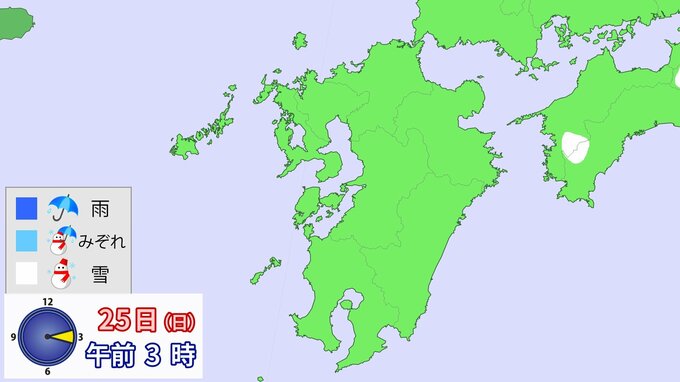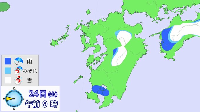 【九州でも大雪】いつどこでどれだけ降る? 雪・雨シミュレーション 23日(金)~25日(日) RKB毎日放送 2026年1月23日(金) 12:00 国内 24日午前6時~25日午前6時までに予想される24時間降雪量(多い所) 山口県:山地15cm・平地3cm 福岡県:山地3cm・平地3cm 佐賀県:山地3cm・平地1cm 長崎県:山地3cm・平地1cm 大分県:山地7cm・平地3cm 熊本県:山地3cm
