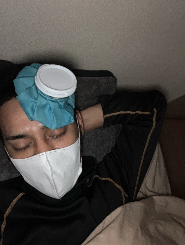 続けて、氷嚢で自身の頭を冷やす画像とともに、「病院行かねば、、、とりあえず、一回寝たい。つらい。」と、症状の辛さを吐露しています。