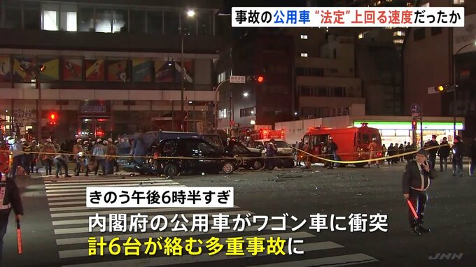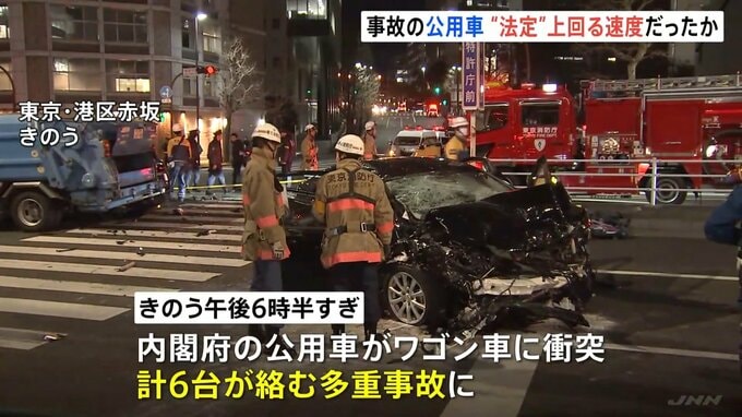 きのう東京・赤坂で、内閣府の公用車が赤信号の交差点に進入して車に衝突、9人が死傷した事故で、公用車が法定速度を上回るスピードで走行していたとみられることがわかりました。