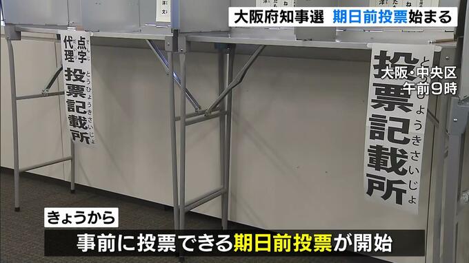 知事の辞職に伴う大阪府知事選挙の期日前投票がきょう=23日から始まっています。 大阪府知事選は、前知事が「大阪都構想」への再挑戦の是非を問いたいとして辞職したことに伴うもので、日本維新の会代表で前知…