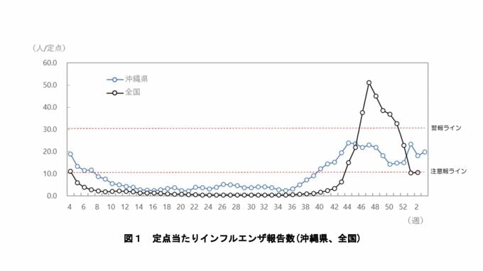 沖縄県内では去年9月末からインフルエンザ注意報の発令が継続していて、今月12日から18日の週に報告された1定点医療機関あたりのインフルエンザ患者数は19.78人となっています。徐々に「B型」の感染報告が増えているということです。