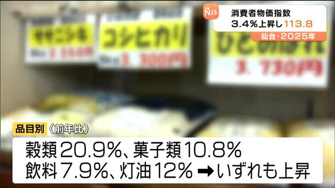 家庭で消費するモノやサービスの値動きを見る消費者物価指数について、仙台市は2025年1年間の平均が前の年よりも3.4%上昇し113.8となりました。