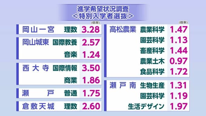西大寺(国際情報)は3.50倍と高倍率、岡山一宮(理数)は3.28倍と高い倍率となっています。それぞれの高校・学科の倍率は【画像①】の通りです。