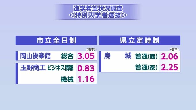 【速報・全校掲載】岡山県公立高校「2026年(令和8年)度・特別選抜」倍率発表 西大寺(国際情報)3.50倍 岡山一宮(理数)3.28倍 倉敷中央(普通・子ども)2.85倍など【2026年1月23日発表】 RSK山陽放送 2026年1月23日(金) 14:09 国内 岡山後楽館・玉野商工・烏城 市立全日制の岡山後楽館は3.05倍と高い倍率。県立定時制の烏城は夜間部が2.25倍。玉野商工(ビジネス情報)は0.83倍と定員割れとなっています。倍率は【画像⑧】の通りです。 【画像⑧】進学希望調査の全画像