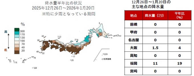 前橋、甲府、名古屋、高知、宮崎の観測点では、同期間の降水量が「0ミリ」を記録しました。大阪も降水量は1.5ミリで平年比4%、福岡も11ミリで平年比19%となっています。