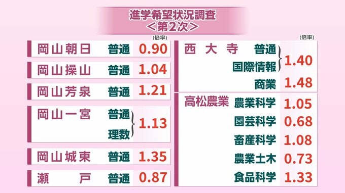 岡山城東(普通)は1.35倍と高倍率。岡山芳泉も1.21倍と高倍率になりました。西大寺(普通・国際情報・商業)も1.40倍と高い倍率となりました。それぞれの高校・学科の倍率は【画像①】の通りです。