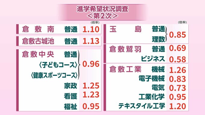 【速報】県立全日制高校「進学希望状況(第二次調査)」発表 西大寺(普通・国際情報)1.40倍 岡山城東1.35倍 岡山芳泉1.21倍【岡山・全50校118科4コース掲載】 RSK山陽放送 2026年1月26日(月) 10:13 国内 倉敷南・倉敷古城池・倉敷中央・玉島・倉敷鷲羽・倉敷工 倉敷中央(家政)は1.25倍、倉敷工業(機械)は1.26倍と高い倍率となりました。それぞれの高校・学科の倍率は【画像④】の通りです。 【画像④】「進学希望状況(第二次調査)」