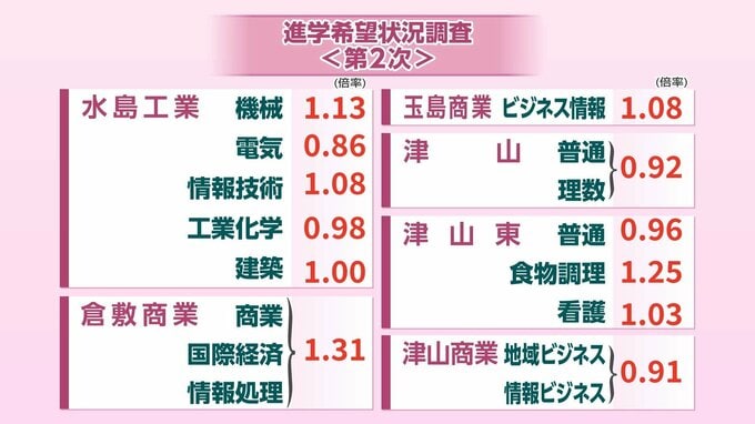 【速報】県立全日制高校「進学希望状況(第二次調査)」発表 西大寺(普通・国際情報)1.40倍 岡山城東1.35倍 岡山芳泉1.21倍【岡山・全50校118科4コース掲載】 RSK山陽放送 2026年1月26日(月) 10:13 国内 水島工・倉敷商・玉島商・津山・津山東・津山商 倉敷商業は1.31倍、水島工業(機械)は1.13倍と高い倍率となりました。それぞれの高校・学科の倍率は【画像⑤】の通りです。 【画像⑤】「進学希望状況(第二次調査)」