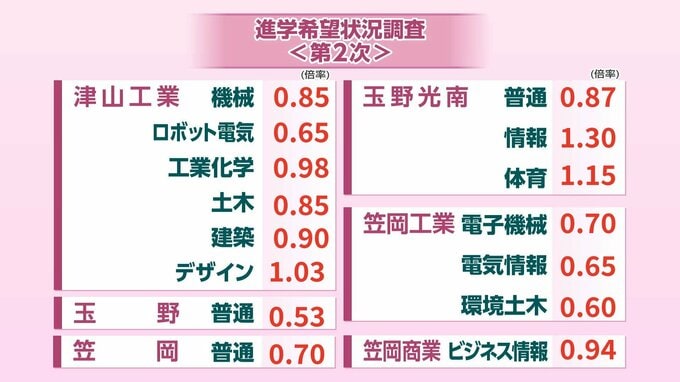 【速報】県立全日制高校「進学希望状況(第二次調査)」発表 西大寺(普通・国際情報)1.40倍 岡山城東1.35倍 岡山芳泉1.21倍【岡山・全50校118科4コース掲載】 RSK山陽放送 2026年1月26日(月) 10:13 国内 津山工・玉野・笠岡・玉野光南・笠岡工・笠岡商 玉野光南(情報)は1.30倍と高い倍率となりました。それぞれの高校・学科の倍率は【画像⑥】の通りです。 【画像⑥】「進学希望状況(第二次調査)」