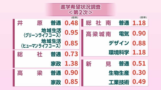 【速報】県立全日制高校「進学希望状況(第二次調査)」発表 西大寺(普通・国際情報)1.40倍 岡山城東1.35倍 岡山芳泉1.21倍【岡山・全50校118科4コース掲載】 RSK山陽放送 2026年1月26日(月) 10:13 国内 井原・総社・高梁・総社南・高梁城南・新見 総社(家政)は1.38倍と高倍率。総社南(普通)も1.18倍と高い倍率となりました。それぞれの高校・学科の倍率は【画像⑦】の通りです。 【画像⑦】「進学希望状況(第二次調査)」