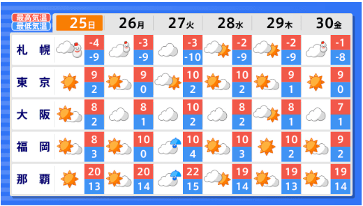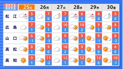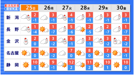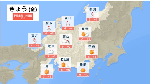 【早期天候情報】北陸地方では1月28日頃~「この時期としては10年に1度程度」の著しい低温となる可能性 気象庁発表 全国の天気を画像で テレビユー山形 2026年1月23日(金) 15:05 国内 ■全国の天気を地方ごとに(画像) 画像はTBS NEWS DIG Powered by JNNより 画像ありの記事を最初から https://newsdig.tbs.co.jp/articles/-/2420707?display=1