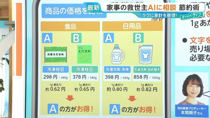 ▼写真や音声をもとに製品を自動認識して、1gあたりの価格などをすぐに計算