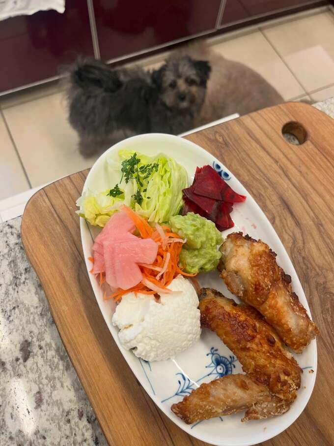 工藤さんは投稿の冒頭、「ビビが狙っている!笑」と、テーブルの上の料理を愛犬が見上げる画像をユーモラスに紹介。