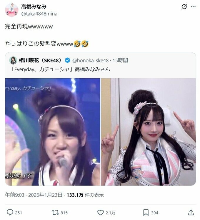 引用元の投稿では、相川暖花さんが「Everyday, カチューシャ」を歌う高橋みなみさんの髪型を完コピして左右に並べた写真が掲載されていました。