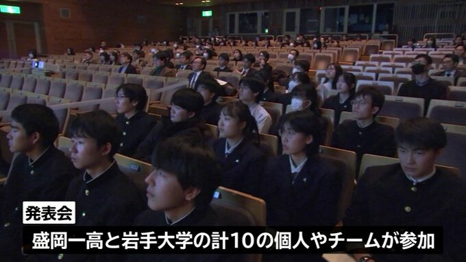 この取り組みは、岩手銀行の子会社の「manordaいわて」が2025年から行っているもので、23日の発表会には、盛岡一高と岩手大学のあわせて10の個人やチームが参加しました。
