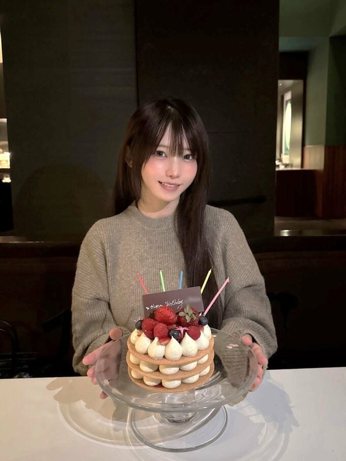 えなこさんは、刺激的だったり幻想的だったりする仕事での装いとは全く離れた、柔らかなニットをまとったリラックスした装いでの写真を投稿。バースデーケーキを前にしてロングヘアを自然に下ろした表情は、ちょっと照れたように微笑んでいます。