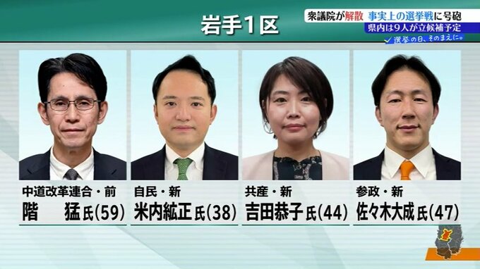 まず、岩手1区は、立憲民主党と公明党が結成した新党、中道改革連合に参加する前職の階猛氏に、前回も立候補した自民党の米内絋正氏と共産党の吉田恭子氏、今回初挑戦となる参政党の佐々木大成氏の新人3人が挑む構図が予想されます。