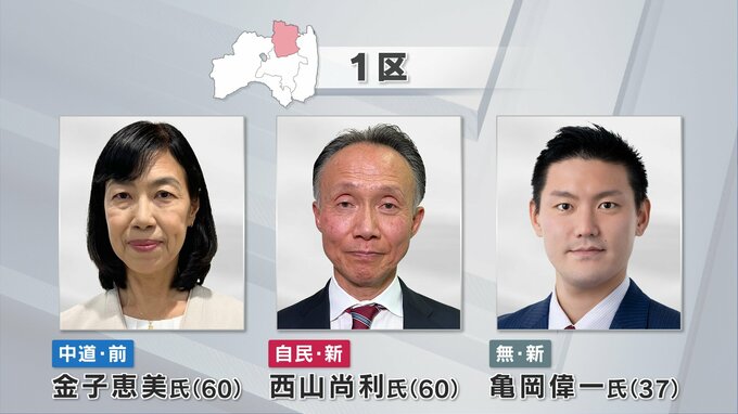 福島市や二本松市などが入る1区。前職で今回、中道改革連合から出馬する金子恵美さん、自民党の新人・西山尚利さん、無所属で新人の亀岡偉一さんの3人が立候補を予定しています。