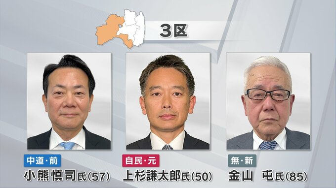 福島県内の立候補予定者15人 全選挙区に3人以上の混戦模様 23日現在【衆議院選挙2026】 テレビユー福島 2026年1月23日(金) 16:37 国内 3区 県内で最も広く、今回雪の影響も懸念されている3区。会津地方と県南地方が入ります。中道の前職・小熊慎司さん、自民党の元職・上杉謙太郎さん、無所属の新人・金山屯さんの3人が出馬を表明しています。
