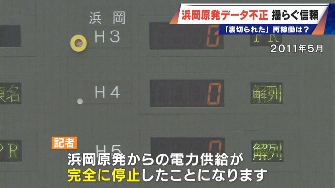 「浜岡原発5号機の発電量を示す値がゼロを示しました。浜岡原発からの電力供給が、完全に停止したことになります」