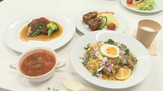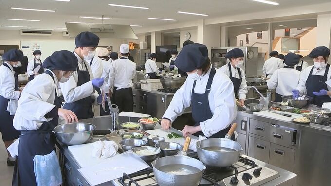 教室には調理科の3年生21人が参加し、ハーブなどの香草を使うことで肉の臭みを取ることができることなど、ジビエ肉のポイントを学びました。そしてイノシシ肉を使ったメンチカツや、シカ肉のスープなど4品を作っていきました。