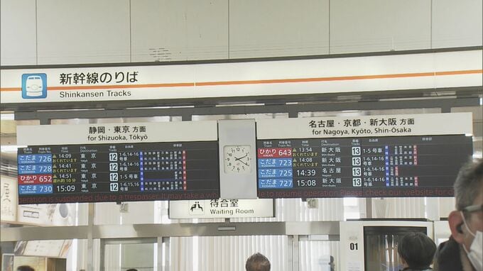 東海道新幹線 「線路内に人が」 50~60代くらいの男性が立ち入り 一時運転見合わせ 静岡方面へと歩き…約30分後に保護される 豊橋駅 CBCテレビ 2026年1月23日(金) 17:17 国内 午後2時半過ぎに運転再開 警察が現在、事情を聞いているということです。東海道新幹線は、午後2時半過ぎに運転を再開しました。 雪による遅れはほぼ解消していますが、この騒ぎの影響で東海道新幹線は現在、上り下りともに最大15分遅れています。