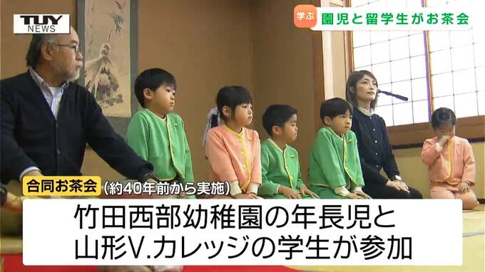 竹田西部幼稚園では園児たちに「もてなし」の心を知ってもらおうと、山形市の専門学校、山形Vカレッジを訪れ毎年、学生たちとお茶会を開いていておととしからは普段日本語や日本の文化を学ぶ留学生も参加しています。