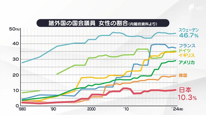 外国に比べて日本は国会議員に占める女性の割合が低いままで、共同参画の必要性を指摘する声も上がっています。