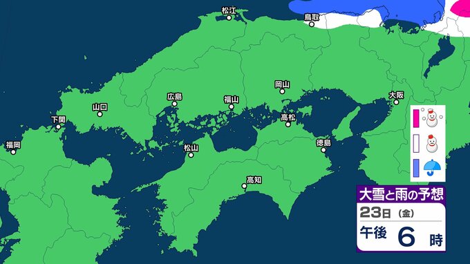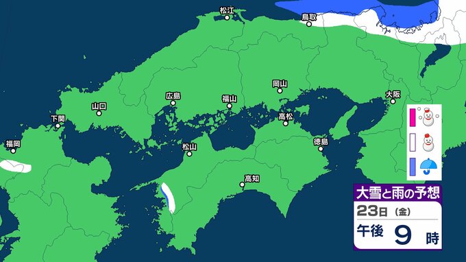気象庁によりますと、山陰地方は、きょう(23日)は、寒気や湿った空気の影響で朝晩を中心に雪が降るでしょう。